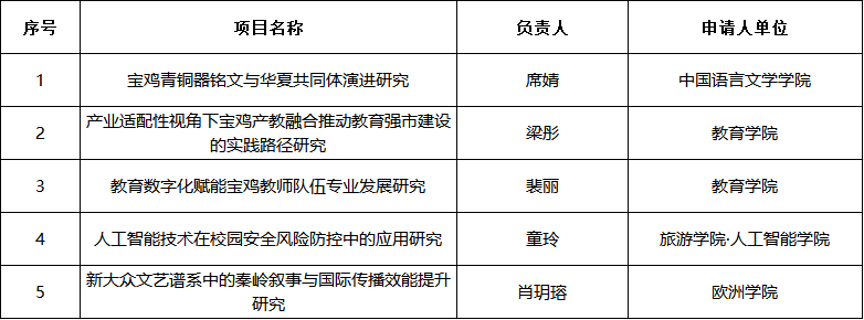 经个人申报,专家评审,科研处审核,拟推荐以下5项课题申报陕西省哲学社会科学研究专项2025年度“宝鸡市教育高质量发展课题”研究项目。